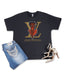 Design-LV7MM: Louis Vuitton Minnie Mouse Rhinestone T-shirt; LV, Large design ~9"Wx13.4"H (gold/crystal/pink/brown/black)