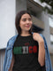 Design-MX3: #MEXICANA Rhinestone T-shirt; Latina; messy bun, Mexico; Large design ~10"Wx12"H (emerald/red/black/beige/crystal) ***FYI: Black rhinestones will appear gray on a black mock-up!